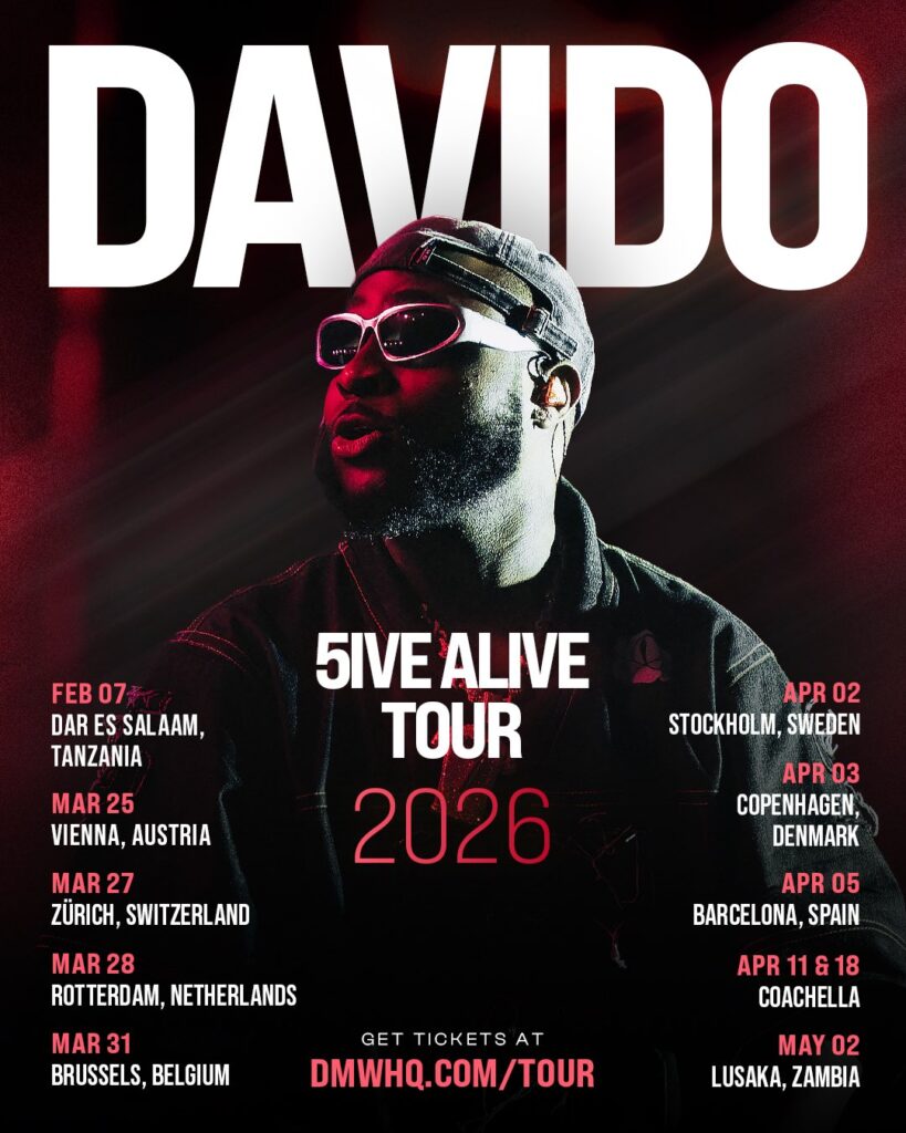 Davido has officially announced additional dates for his ongoing 5ive Alive World Tour, extending the global run into 2026 with new stops across Africa, Europe, and North America. The expansion follows the success of the tour’s earlier legs and continues the Afrobeats star’s worldwide push in support of his 5IVE album era.