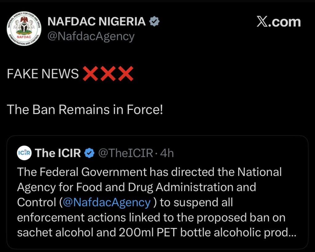 Just hours after reports circulated claiming the Federal Government had directed a pause on the sachet alcohol ban, the National Agency for Food and Drug Administration and Control (NAFDAC) has pushed back strongly, insisting that no such directive has been officially communicated and that the policy remains in force.
